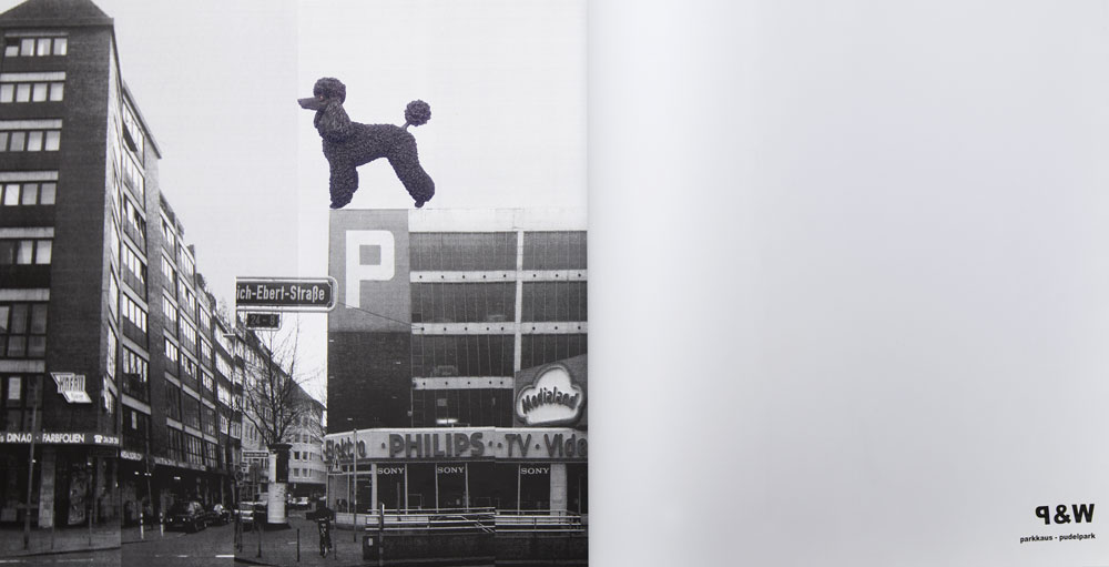 Mark Pepper und Thomas Woll verfolgen neben ihrer individuellen künstlerischen Arbeit kontinuierlich Gemeinschaftsproduktionen und Interventionen in städtischen Räumen. Für das Parkhaus in Düsseldorf konzipieren sie eine temporäre Intervention, die eine ungewöhnliche Brache im städtischen Raum aktiviert. Das großflächige Parkhaus-Deck unter freiem Himmel wird als ungewöhnlicher Aussichtspunkt und Erlebnisraum im Alltag inszeniert. Ironisch wird hierfür ein neues Symbol ins Leben gerufen: der Pudel als synonymes Wahrzeichen urbaner Lebensqualität und Domestizierung. Zwei Pudel-Skulpturen, die sich der architektonischen Ausstattung des Gebäudes anpassen, bekrönen als architektonische Wahrzeichen weit sichtbar das obere Parkdeck.